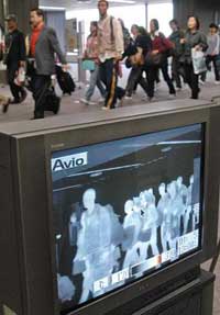 Passengers who disembarked a flight from Guangzhou, walk beside an infra-red camera as their temperatures are scanned at the Narita airport, east of Tokyo, Wednesday, Jan. 7, 2004. [AP Photo]
