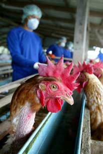 A Thai livestock official collects chickens to be destroyed at a farm in Supanburi province, 105 km north of the capital Bangkok on January 23, 2004. Thais and tourists in Bangkok are shunning chicken after the government confirmed two Thais have caught bird flu, but visitors said they were not afraid to come to the country. [Reuters]