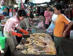 A Cambodian woman buys chicken in a market in Phnom Penh, Cambodia Saturday, Jan. 24, 2004. Cambodia and Thailand announced Friday that outbreaks of the avian flu in chickens had been confirmed, bringing to six the total number of countries affected. [Xinhua]