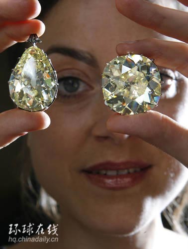 5月8日,著名的索比斯拍賣行在日內瓦展出了兩顆價值連城的珍稀黃鉆。其中一顆梨形黃鉆重約82.48克拉,另一枚圓形黃鉆則重達102.54克拉。這兩顆高純度黃鉆又被稱為“唐納克斯鉆”,將于5月17日在日內瓦拍賣,估價約為150萬美元至200萬美元。