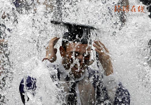 5月10日,在美國紐約華盛頓廣場公園,紐約大學第175屆畢業典禮結束后,一名畢業生興奮地跳入噴泉,慶祝自己順利畢業。