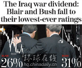 環球在線消息:英國《獨立報》5月11日頭條消息:伊拉克戰爭成就的一對“難兄難弟”——布什、布萊爾支持率雙雙跌至歷史最低。