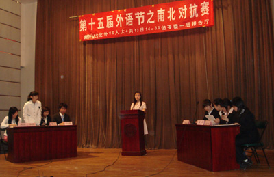 南開大學第十五屆外語節之南北對抗賽4月13日在南開大學伯苓樓一層報告廳舉行。北京外國語大學和人民大學分別派隊參加了本次比賽,與南大學子同場競技。南開大學外國語學院James、王慶勇老師等擔任大賽評委,院團委李娜老師等同全場觀眾一起觀看了這場精彩的辯論。