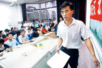 在北京當保安的譚景偉自稱從苦難中理解《論語》精髓,用自己對生活的感悟寫出20萬字的《論語布衣解》。本報曾于2007年4月20日刊登了《解論語北大保安挑戰于丹》的報道。昨天,譚景偉實現了自己的夢想,在北大理科教學樓的一個教室里開講自己的《論語》心得。