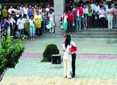 花前月下,一個男生抱著吉他仰望心儀女生的窗臺,輕輕吟唱著抒情歌曲……羅曼蒂克的求愛場景在大學校園屢見不鮮。連日來,一組標榜為“大學驚現史上最牛的求愛!”的組照在一些知名網站的社區流傳,青島理工大學一男學生在數百名學生圍觀之下向女生示愛,但另類的求愛遭到保安驅散,而且換來一紙處分。學校的做法引發網上愛情曬客猛烈抨擊:浪漫愛情宣言搞成了糗事,不僅會扼殺大學生的創造力,還剝奪了自由表達的權利。