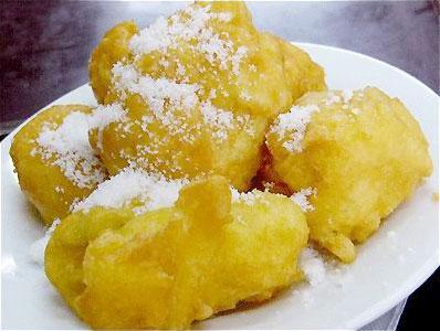 鍋內倒花生油或生菜油,也可用牛油。但不宜用豆油或芝麻油,因為后兩種油容易抵消奶油味,旺火燒至冒煙后,改用小火,此時將揉勻攪拌好的面團,500克分成40個均勻小球,人油鍋前用手摁成圓餅,逐個下人油中,待餅膨起如球狀,并呈金黃色時撈出,滾上白糖即成。