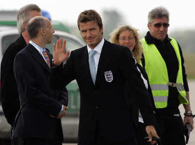 England's national soccer team captain David Beckham (C) waves to the media as he arrives at the Baden-Baden airport June 5, 2006. England meets Paraguay at the FIFA 2006 Soccer World Cup in Frankfurt on June 10. (Reuters)