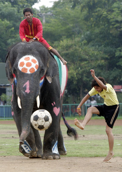 Thai student plays soccer with an elephant in Ayutthaya province, 80 kilometers (50 miles) north of Bangkok, Thailand June 22, 2006. (Reuters)