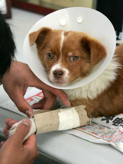 A stray dog receives medical treatment at Beijing's Human and Animal Environmental Education Center, a shelter for homeless animals, June 26, 2006. At present, the center houses about 500 animals, and many of them abandoned are either old, weak, sick or disabled. (Reuters)