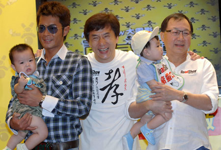 Hong Kong actors Jackie Chan (C), Louis Koo (L) and Michael Hui attend a news conference to promote their new movie 'Rob-B-hood' in Hong Kong August 1, 2006. (Reuters)