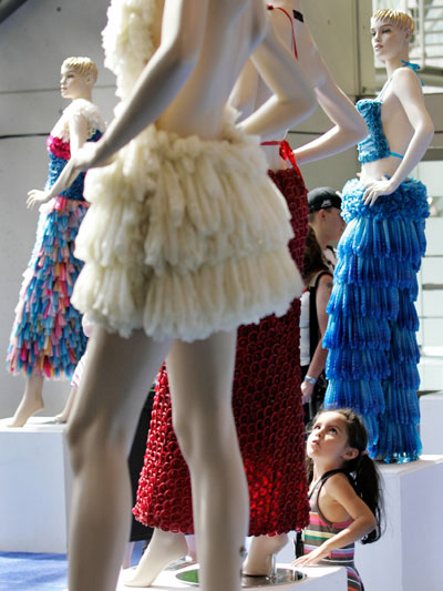 A girl looks at a dress made of condoms by Brazilian artist Adriana Bertini at the International AIDS Conference in Toronto August 17, 2006. (Reuters)