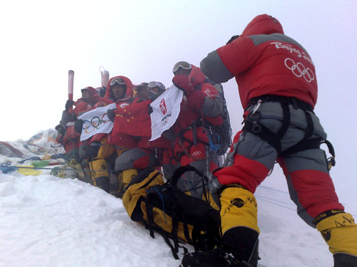 Chinese climbers hold the Olympic torch, the Olympic flag (L), the Chinese flag (C ) and the Beijing Olympics emblem at the peak of Mt. Qomolangma after the Olympic torch is lit at the peak of the mountain. The climbers carrying the Olympic torch stated to scale the peak at 3:00 am on Thursday morning and reached peak of 8848.43 meters around 9:17 am. [Xinhua]  for more photos