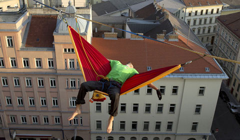 Thrillseeker Igor Scotland rigged up his highline and secured a red and yellow hammock to it 100ft above the ground before enjoying some all-important me time. The urban adventurer - who also designs bespoke highwire hammocks - bedded down for the afternoon between the public aquarium in Haus des Meeres Zoo, Vienna, Austria. [Photo/icpress.cn]