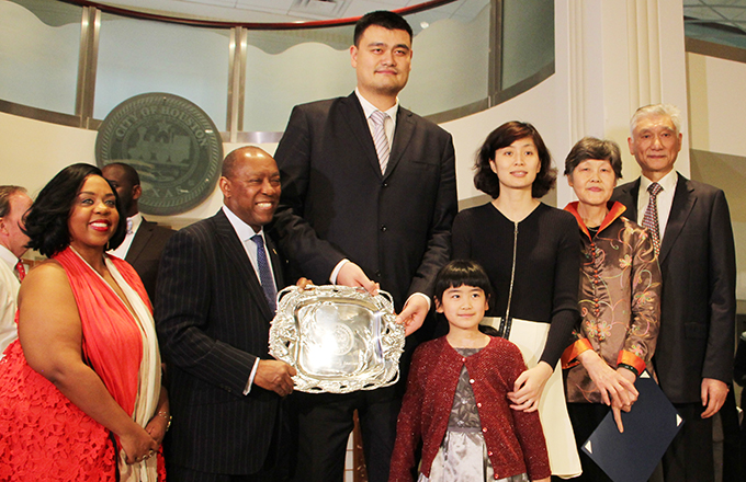 The 7-foot-6 Yao was with the Rockets for eight seasons and averaged 19 points and nine rebounds a game. He was elected to the basketball Hall of Fame in April.