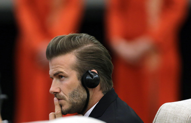English football star David Beckham sits next to officials during a football campaign by Adidas at Zhixin High School in Guangzhou city, south China′s Guangdong province, June 28, 2016.