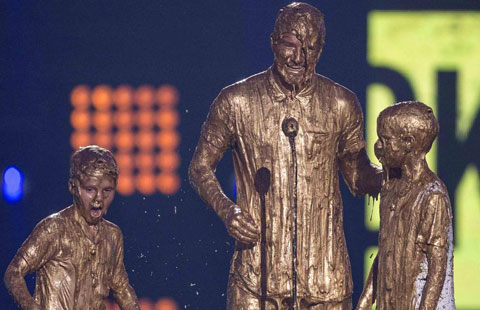 David Beckham accepts the Legend Award with sons during the inaugural 2014 Nickelodeon Kids' Choice Sports awards in Los Angeles.