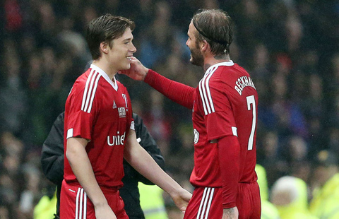 David Beckham is substituted for son Brooklyn Beckham during the Match for Children in aid of Unicef between Great Britain XI v Rest of World XI played at Old Trafford, Manchester on November 14, 2015.