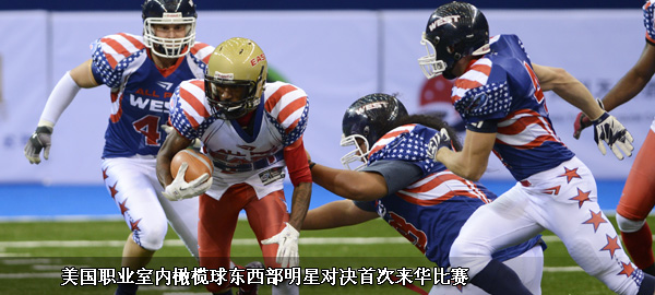 2013年11月10日,北京,美國職業室內橄欖球表演賽在首都體育館舉行,這是美國職業室內橄欖球隊首次來華表演比賽。來自費城東部明星隊和亞利桑那西部明星隊由美國室內橄欖球聯盟(AFL)俱樂部的球員選拔組成,代表了全美職業室內橄欖球的最高水平。