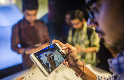 A visitor looks on her mobile phone in front of an illuminated object during the Christmas Garden event at botanic garden in Berlin, Germany, November 18, 2016. [Photo/Agencies]